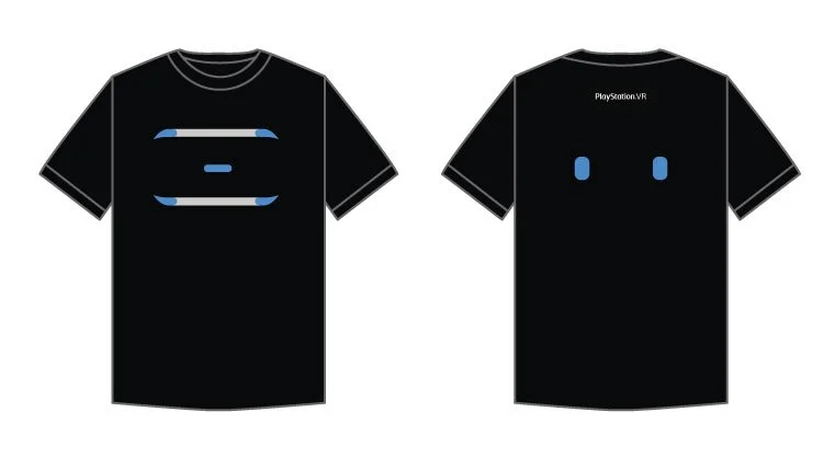 To celebrate the release of PlayStation-VR I designed tee shirts with minimal shapes nodding to the shape and light-up pattern of the actual headset. These were printed for PS staff to wear at events.